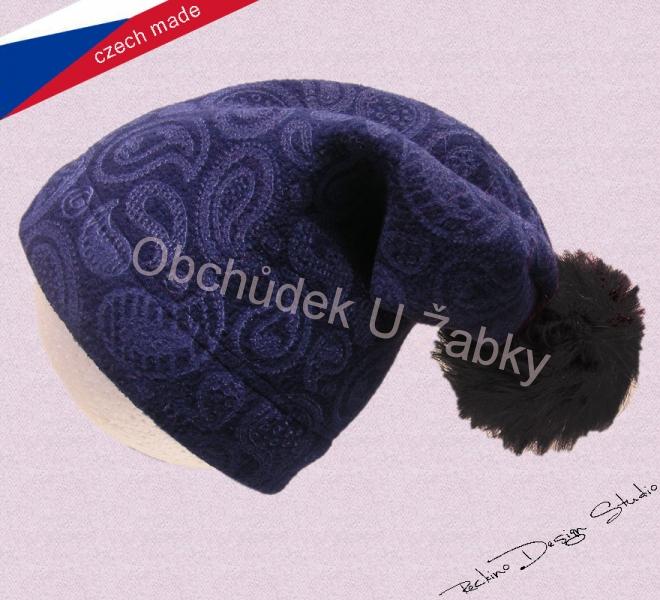 Dívčí čepice z polaru. Potisk a střih "padeného" typu, ozdobná bambule s dlouhým lesklým vlasem.