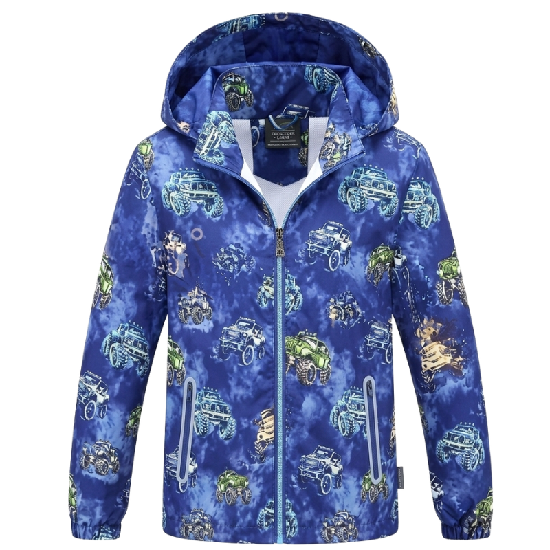 Bunda (nepromokavá) s látkovou podšívkou, celopropínací, .kapucka - je oddělitelná na zip. Rukávy jsou do gumy. Vpředu jsou dvě kapsy na zip. Dole na konci bundičky nejsou olivky na stažení.
