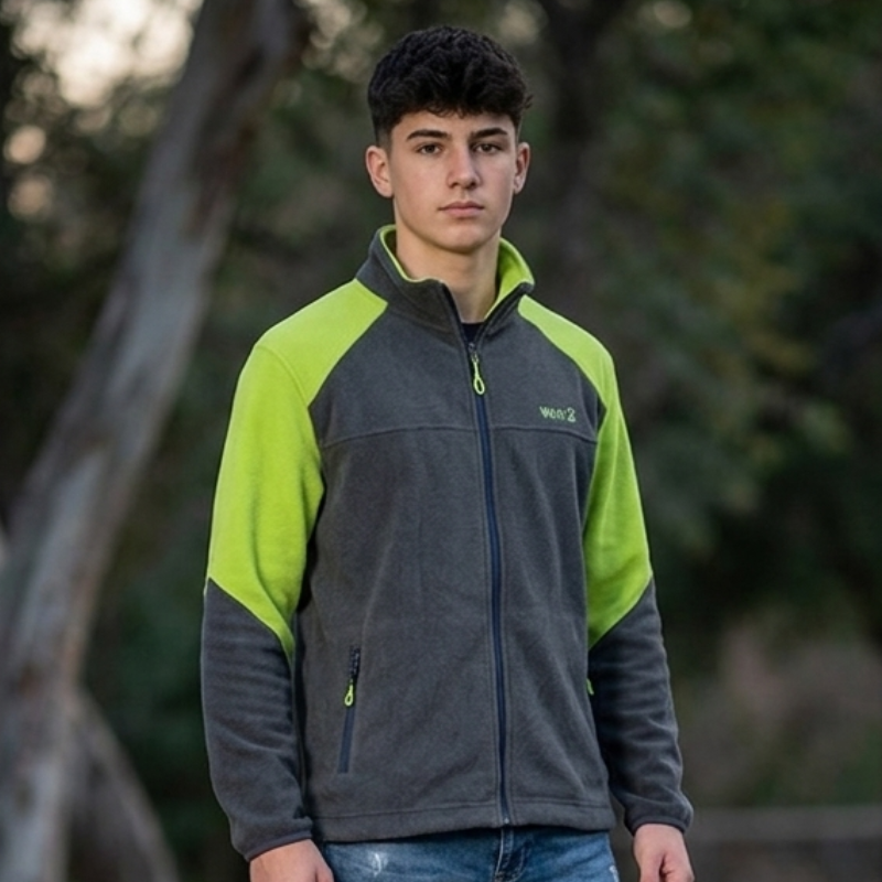 - fleesová mikina(střední flees), celopropínací na zip, vpředu dvě kapsičky na zip, v rukávě je otvor na paleček