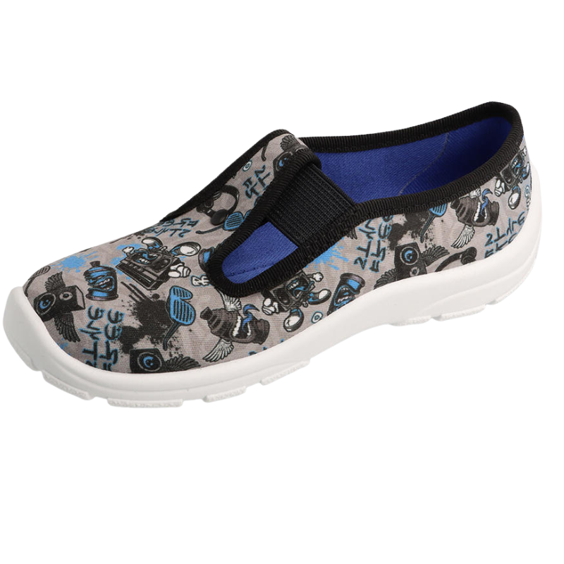 vrchní a vnitřní část je textilní, mají pružnou podrážku, mírně vyvýšená pata, zapínání na suchý zip, pevný opatek,