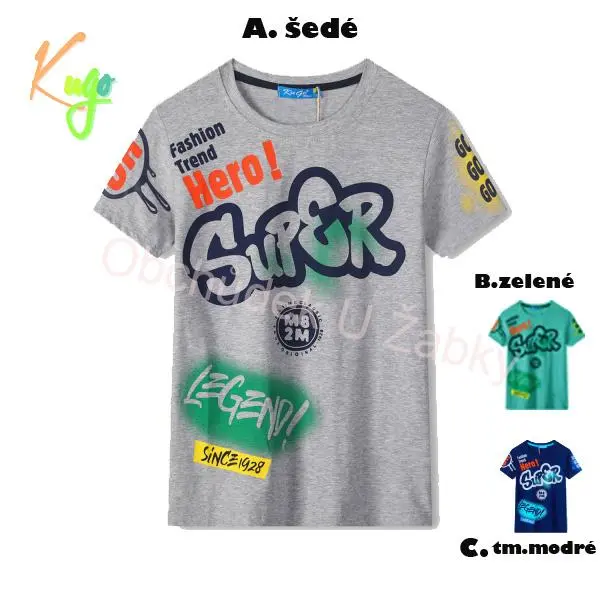Chlapecké tričko Kugo, krátký rukáv 95% bavlna+5% elastan prací symboly - praní v pračce na 30 stupňů, žehlení do 110 stupňů, slabé sušení v sušičce   velikostní tabulka: velikost 134 - Délka  54 cm, šířka 37*2 cm velikost 140 - Délka  56 cm, šířka 38*2 cm velikost 146 - Délka  58 cm, šířka 3...