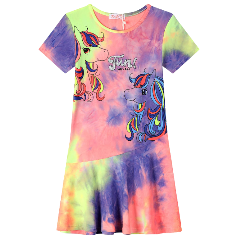 Dívčí šaty složení 95% polyester+5% elastan Rozložení barev může být různé, neshoduje se s obrázkem, jedná se o batiku. prací symboly - praní v pračce na 30 stupňů, může se sušit v sušičce.     velikostní tabulka: velikost 98 - délka od ramene 52 cm, šířka 29*2 cm velikost 104 - délka od ramene...